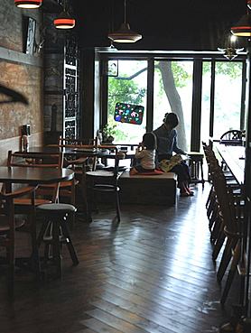 那珂川のほとりにある「喫茶・喫酒 おまめ」